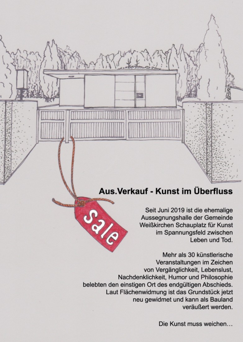 Seit Juni 2019 ist die ehemalige Aussegnungshalle der Gemeinde Weißkirchen Schauplatz für Kunst im Spannungsfeld zwischen Leben und Tod. Mehr als 30 künstlerische Veranstaltungen im Zeichen von Vergänglichkeit, Lebenslust, Nachdenklichkeit, Humor und Philosophie belebten den einstigen Ort des endgültigen Abschieds. Laut Flächenwidmungsplan ist das Grundstück jetzt neu gewidmet und kann als Bauland veräußert werden. Die Kunst muss weichen…